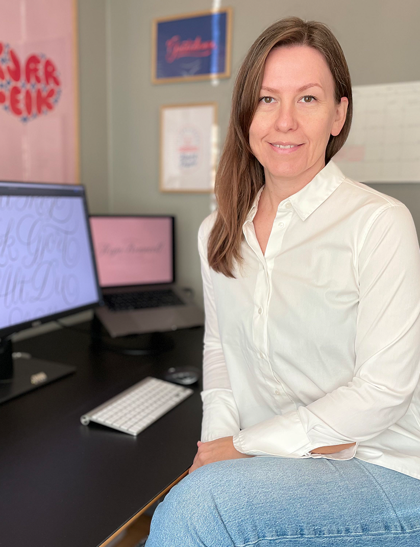 Jeg heter Kaja, og er grafisk designer med hjerte for håndtegnet skrift. Jeg har jobbet som designer i over 20 år og har alltid elsket å skape unike verk som sprer farger, glede og inspirerende budskap. Om mine produkter kan få deg til å smile, føle deg sett – eller kanskje litt mer hjemme i deg selv – da betyr det alt for meg. Takk for at du er her, og for at du støtter norske småskala virksomheter.