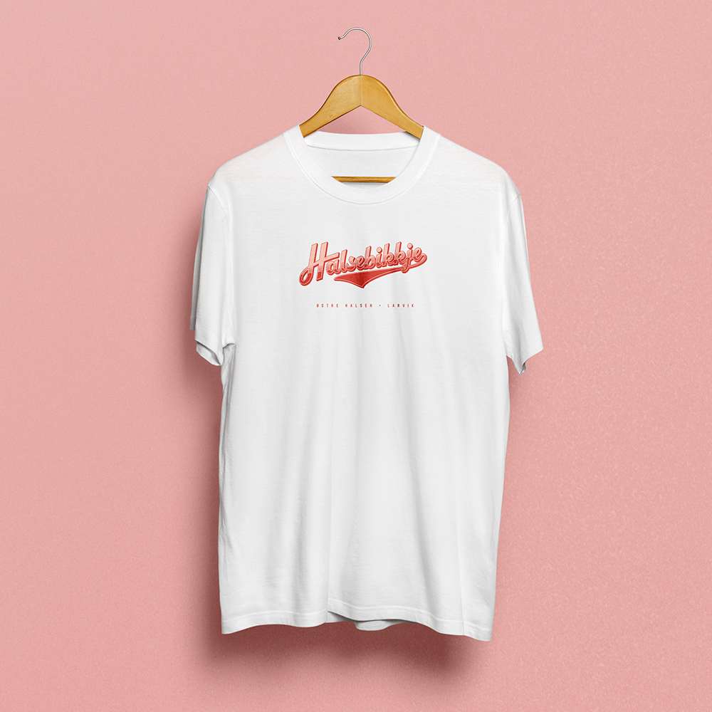 Halsebikkje-logoen er designet og håndtegnet av meg, og silketrykket av Larvikskunstner Pål Gunnæs på t-skjorter i 100 % økologisk bomull.