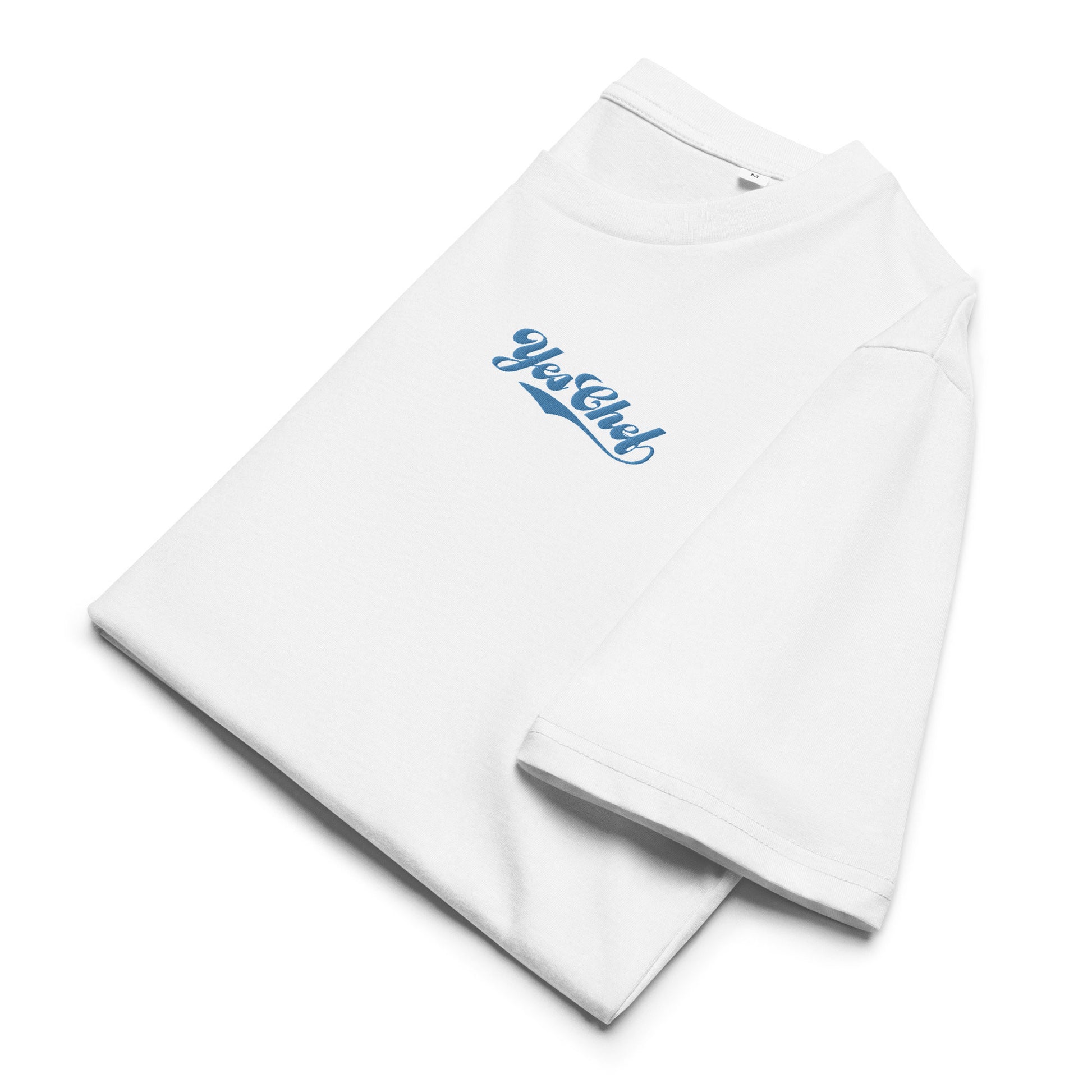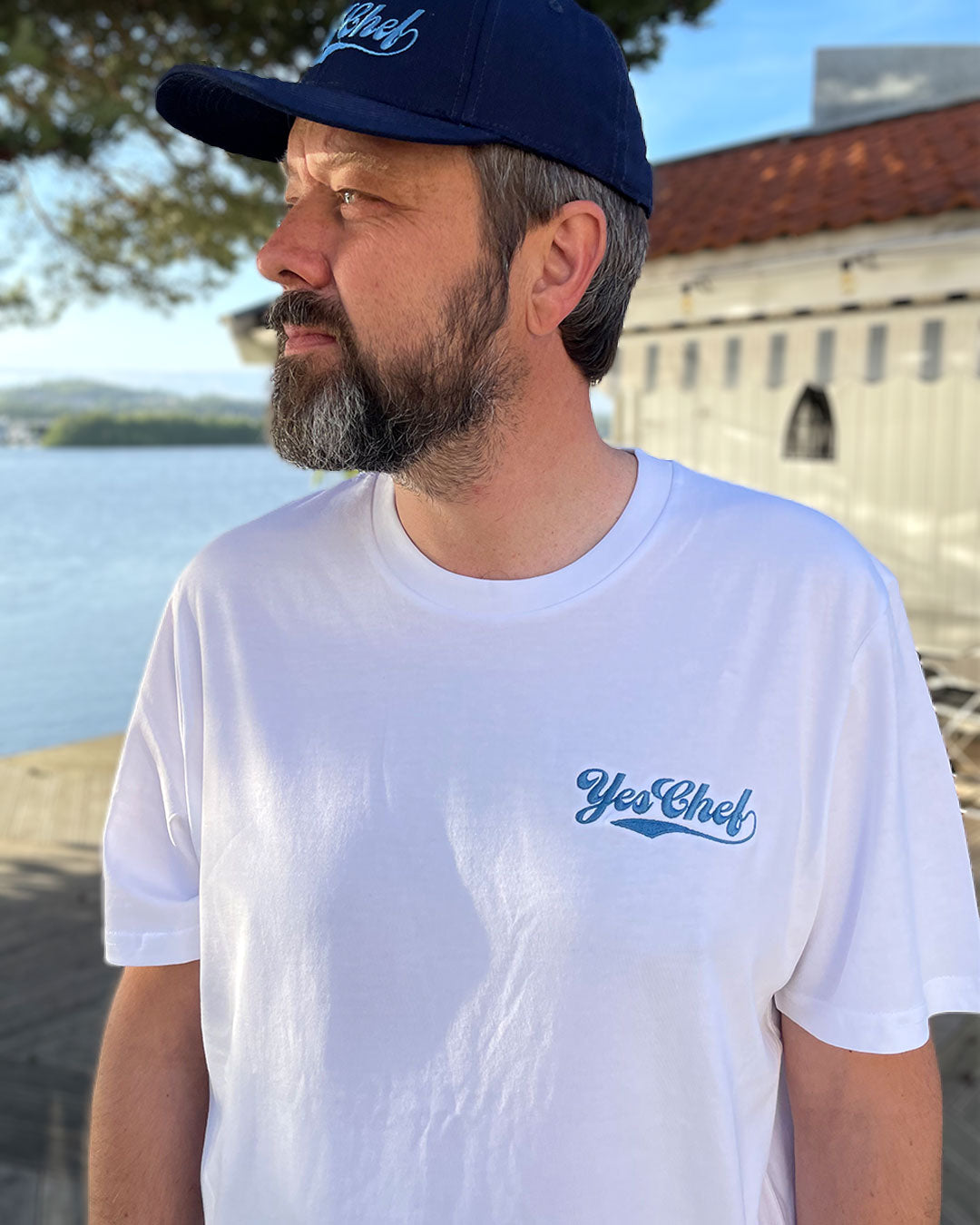 Yes Chef er håndtegnet for å gi designet en unik look. Brodert i nydelig blåfarge på hvit t-skjorte i 100 % øko bomull.